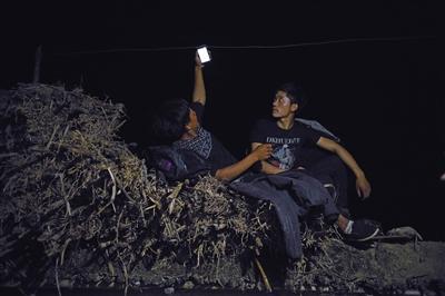 圖為5月12日晚上,村民坐在玉米稈上搜尋手機(jī)信號(hào),村里沒有發(fā)射塔,全靠山下發(fā)射到的微弱信號(hào)接收手機(jī)短信和打電話。9點(diǎn)多鐘,勒爾小學(xué)校長(zhǎng)吉克拉者帶著15個(gè)孩子到山下,其中有陳古吉的5個(gè)孩子,4個(gè)女孩1個(gè)男孩,最小的男孩叫陳木黑,6歲,讀學(xué)前班。爬山開始前,陳木黑被陳古吉系上背包繩。前面由一個(gè)家長(zhǎng)引路,中間一個(gè)家長(zhǎng),陳古吉帶著陳木黑走最后,6歲的陳木黑已經(jīng)在這條路上,上上下下幾十次了。在爬垂直藤梯的時(shí)候,陳古吉會(huì)從后面微微提繩,讓兒子能夠省點(diǎn)力氣,跟上前面的哥哥姐姐。在通過(guò)沒有任何附著物的崖壁上的道路時(shí),陳古吉就格外小心,緊抓繩子的手有時(shí)青筋暴起。他說(shuō),前些日子,一個(gè)娃滑了一下,幸好崖邊的藤條擋住了,才撿回一條命。