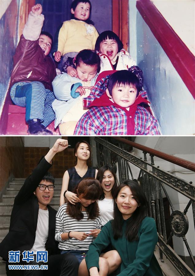 上圖:唐文磊(左一)和幾個(gè)小伙伴在上海市北蘇州路附近一幢大樓內(nèi)的樓梯間合影(1992年攝,資料照片);下圖:5月25日,唐文磊(左一)和上圖中的小伙伴在上海市北蘇州路附近一幢大樓內(nèi)的樓梯間合影(新華社記者 丁汀 攝)。新華社發(fā)