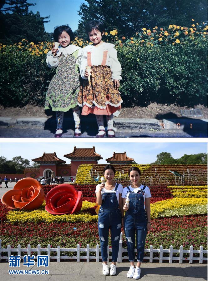 上圖:來自遼寧的朱虹4歲時(shí)手捧鮮花留影(1988年攝,資料照片);下圖:5月27日,32歲的朱虹手捧鮮花留影(新華社記者 潘昱龍 攝)。新華社發(fā)