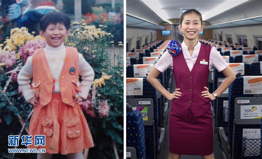左圖:劉嘉楠6歲時(shí)的留影(1998年攝,資料照片);右圖:5月25日,24歲的南昌鐵路局福州客運(yùn)段動(dòng)姐劉嘉楠在動(dòng)車內(nèi)留影(新華社記者 宋為偉 攝)。新華社發(fā)
