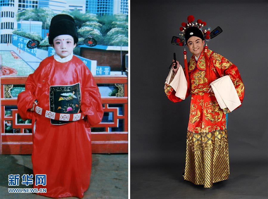 左圖:1992年“六一”兒童節(jié),6歲的李一博身著戲裝,在陜西省韓城市龍門鎮(zhèn)一家國營照相館留影(資料照片);右圖:5月30日,30歲的李一博身著戲裝,在陜西省西安市國色天香戲曲攝影工作室用遙控設(shè)備自拍留影。新華社發(fā)