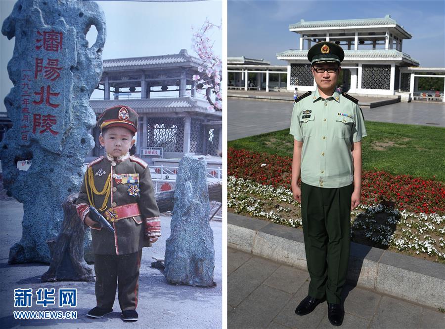 上圖:來自遼寧的雷鳴三歲時(shí)在沈陽市北陵公園留影(1993年攝,資料照片);下圖:5月28日,遼寧公安邊防總隊(duì)警官雷鳴在沈陽市北陵公園留影(新華社記者 潘昱龍 攝)。 新華社發(fā)