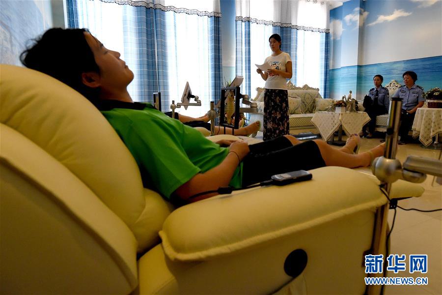 6月26日是國際禁毒日,今年的主題是“無毒青春健康生活”。在禁毒日前夕,記者走進了河南省唯一的女子強制隔離戒毒所及唯一的未成年人強制隔離戒毒所。近年來,戒毒所注重對戒毒人員的溫情關懷救助,搭建戒毒治療綜合性平臺,努力為戒毒人員打造“溫馨之家”,設置了瑜伽室、健身室、心理咨詢室等場所,通過開展各種體育鍛煉、心理咨詢、職業(yè)技能培訓以及社會適應性教育等活動,幫助戒毒人員強化體能、修復身心損害,使他們可以盡快走出困境,融入社會。新華社記者 李安 攝