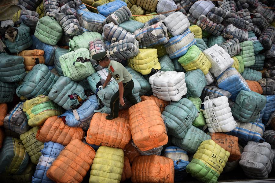 廣東邊防總隊(duì)深圳市邊防支隊(duì)近日偵破一起團(tuán)伙走私舊服裝大案,打掉一個(gè)專業(yè)走私舊服裝的犯罪團(tuán)伙,抓獲犯罪嫌疑人6名,并在涉嫌從香港走私“洋垃圾”到內(nèi)地的“利運(yùn)達(dá)號(hào)”貨船上查繳舊服裝、帆布等549噸,案值約1100萬(wàn)元。圖為邊防戰(zhàn)士查看繳獲的舊衣物。 新華社記者 毛思倩 攝 圖片來(lái)源:新華網(wǎng)