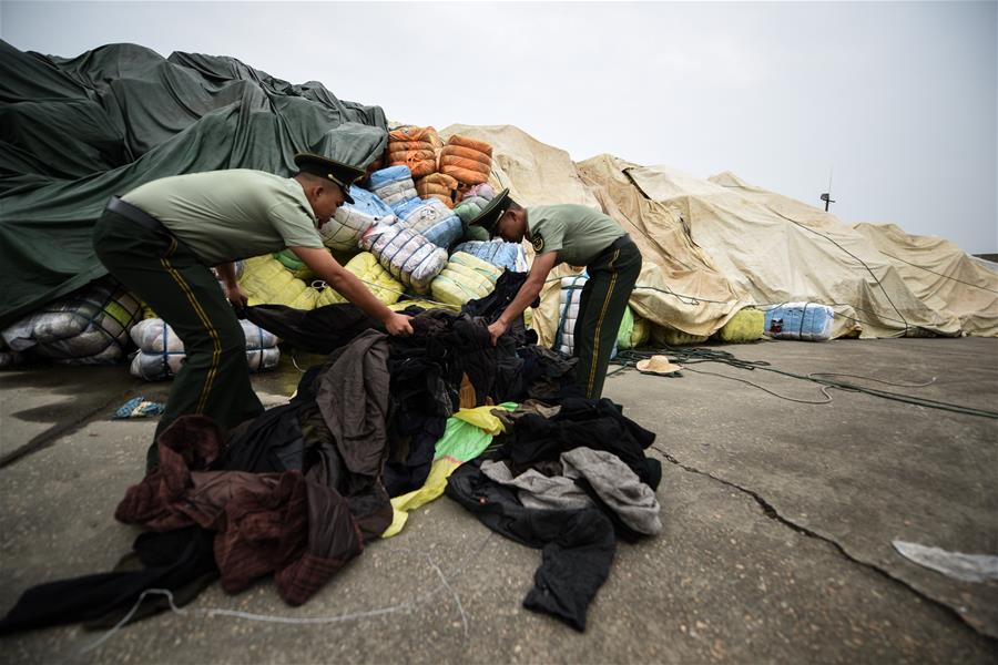 廣東邊防總隊(duì)深圳市邊防支隊(duì)近日偵破一起團(tuán)伙走私舊服裝大案,打掉一個(gè)專業(yè)走私舊服裝的犯罪團(tuán)伙,抓獲犯罪嫌疑人6名,并在涉嫌從香港走私“洋垃圾”到內(nèi)地的“利運(yùn)達(dá)號(hào)”貨船上查繳舊服裝、帆布等549噸,案值約1100萬(wàn)元。圖為8月9日,邊防戰(zhàn)士查看繳獲的舊衣物。 新華社記者 毛思倩 攝 圖片來(lái)源:新華網(wǎng)