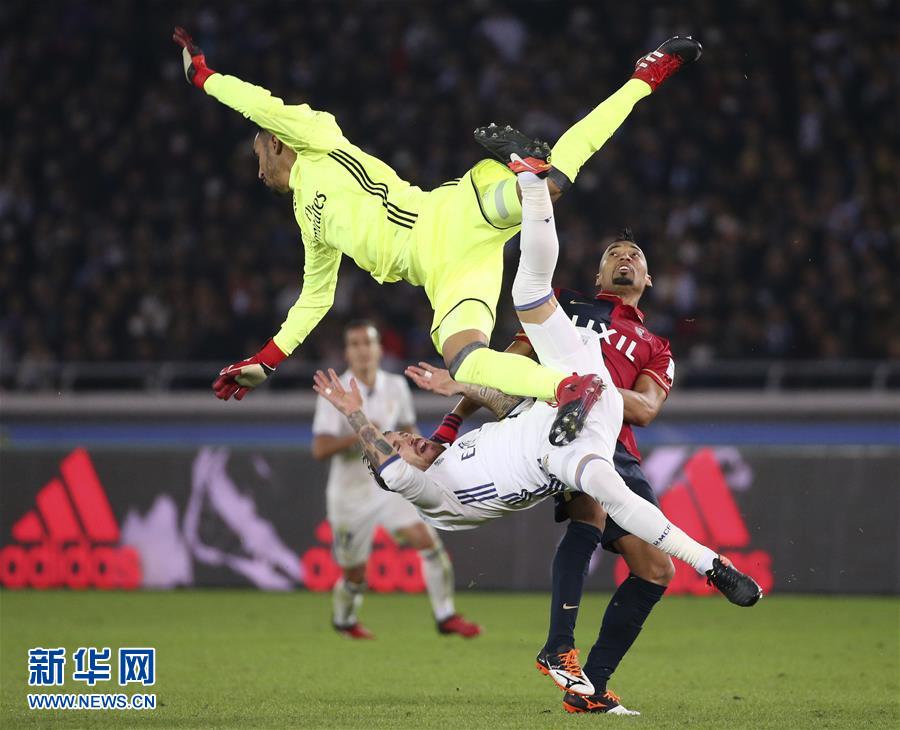 12月18日,皇家馬德里隊(duì)球員拉莫斯(下)、守門(mén)員納瓦斯與鹿島鹿角隊(duì)球員法布里西奧拼搶時(shí)撞在一起。新華社/美聯(lián)