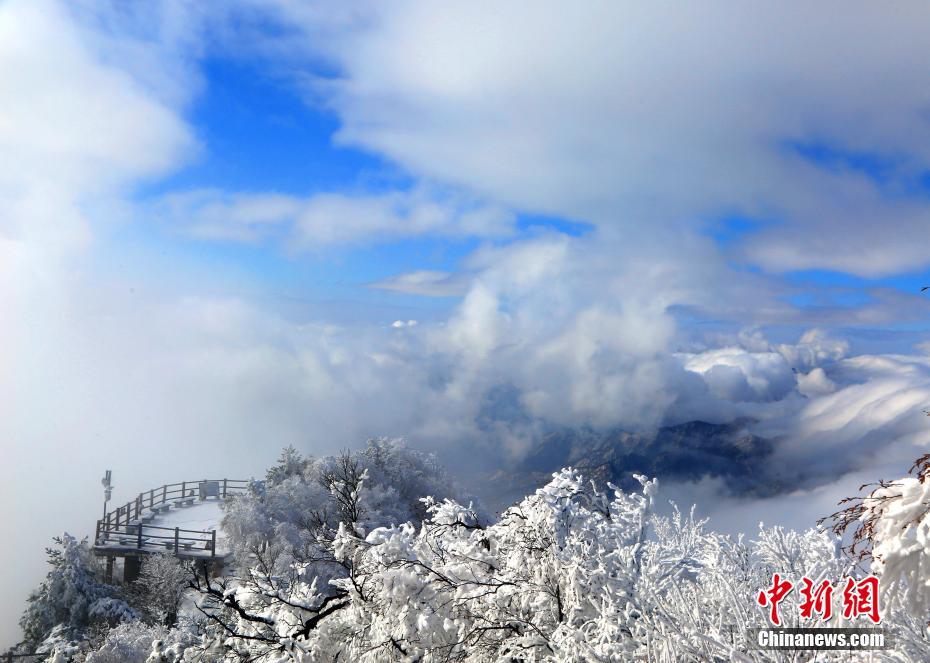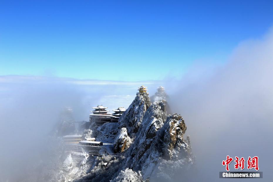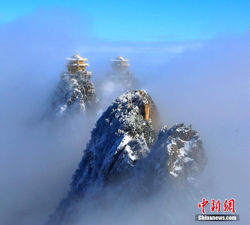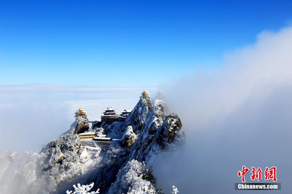 1月7日,連續(xù)降雪之后,位于河南洛陽(yáng)的道教圣地老君山雪后初晴,海拔2000米的伏牛山主峰上,白雪皚皚、銀裝素裹,加之云海浮現(xiàn)與藍(lán)天白云交相輝映,絕壁道觀似瓊樓玉宇幻如仙境美不勝收。圖為云海與藍(lán)天白云交相輝映。王中舉 攝