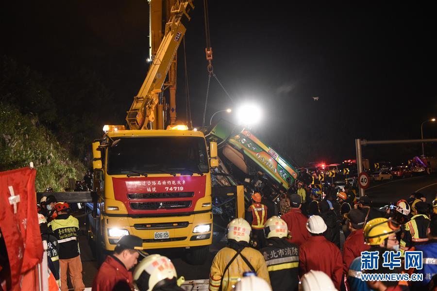 2月14日,事故車輛車體被吊車扶正。據(jù)臺灣消防部門2月14日零時許發(fā)布的消息,13日晚發(fā)生的翻車事故已造成32人死亡,受傷的12人已全數(shù)送醫(yī)。新華社記者從臺灣公路警察部門獲悉,游覽車上沒有大陸游客。臺北市消防局通報,13日21時6分許,在臺灣公路主干道5號南港系統(tǒng)交流道接3號南下路段,臺北市蝶戀花公司一輛游覽車翻覆于引道邊坡,車內(nèi)共44人(游客42人,導(dǎo)游、司機(jī)各1人),其中死亡32人(30人未送醫(yī),2人送醫(yī)后不治),12人送醫(yī)持續(xù)治療中。新華社記者 歐東衢 攝