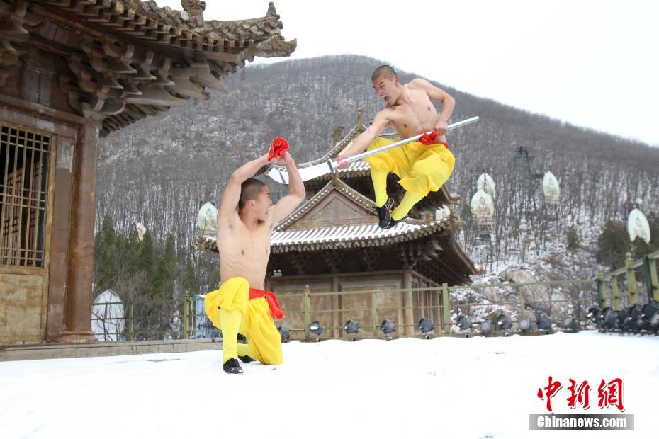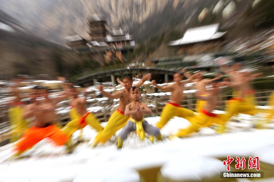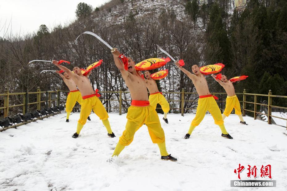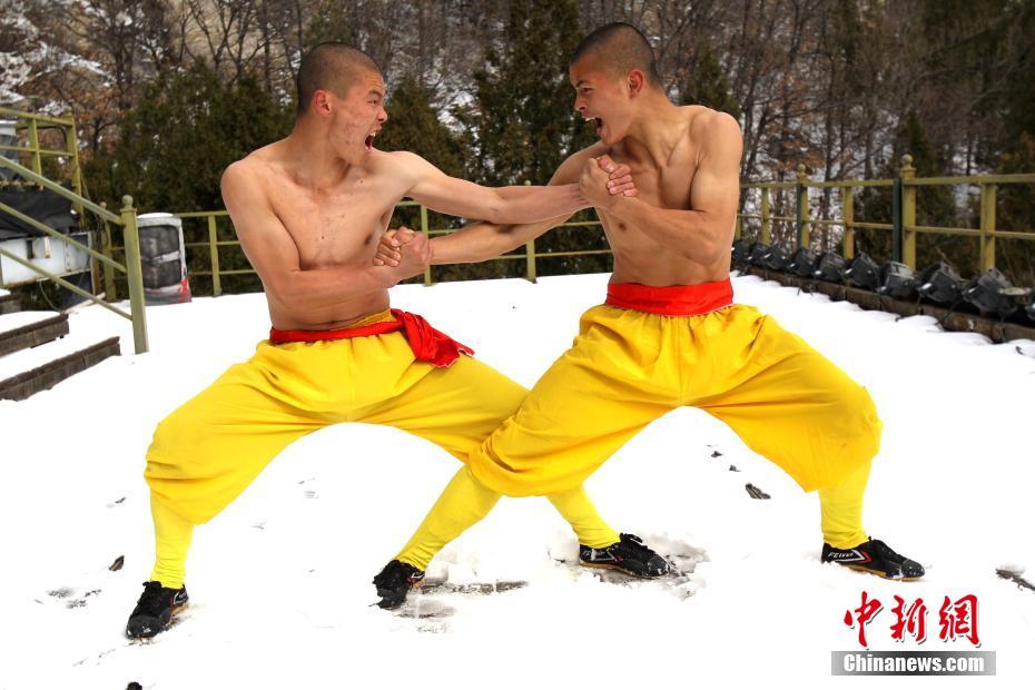 2月22日,河南出現(xiàn)暴雪天氣,氣溫驟降,少林寺所在地登封嵩山白雪茫茫,銀裝素裹,武僧們赤膊上身在冰天雪地里苦練少林功夫。盡管寒風(fēng)刺骨,少林武僧們依舊照常練功,只見他們赤膊上陣,不懼寒冷,在雪窩里扎馬步、練少林棍、刀槍對(duì)戰(zhàn)。他們中間最小的只有6歲。 中新社記者 王中舉 攝