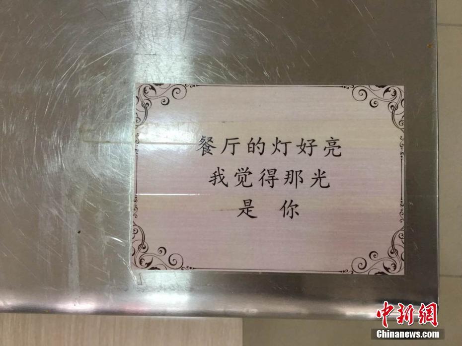 記者16日在西北政法大學(xué)雁塔校區(qū)綜合餐廳里看到,這些富有創(chuàng)意的三行情書貼于餐桌的右下角,語(yǔ)句詼諧幽默,浪漫十足,不時(shí)有買飯路過的學(xué)生駐足觀看,還有人拿出手機(jī)拍照。不少慕名而來的外校生專程前來蹭飯,體會(huì)“樸素的食堂愛情故事”。燕武 阿琳娜 攝影報(bào)道