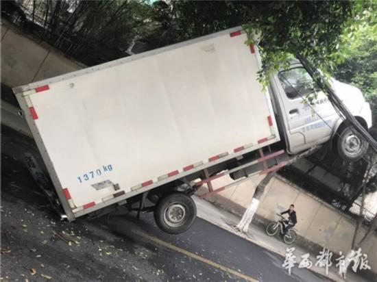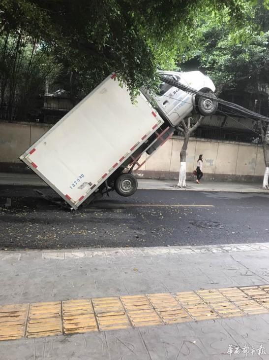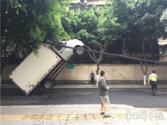 5月10日早上,成都高升橋北街,一輛貨車玩起“特技”,車頭掛在線纜上,四輪騰空,造成道路擁堵,索性無人員傷亡。隨后,記者從成都交警一分局獲悉,該事故的罪魁禍?zhǔn)祝堑袈涞耐ㄓ嵕€纜。來源:華西都市報