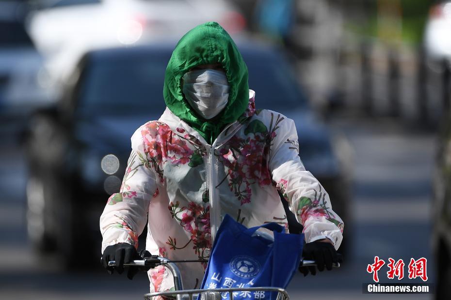 5月17日,山西太原,民眾在烈日下“全副武裝”出行。據(jù)中央氣象臺(tái)消息,17日-19日,北方多地將遭遇今年以來首次大范圍高溫天氣,涉及京津冀、內(nèi)蒙古等7省市區(qū),其中18日高溫范圍最廣、強(qiáng)度最大,內(nèi)蒙古東部偏南地區(qū)局地更有可能出現(xiàn)38-40℃的最高氣溫。武俊杰 攝