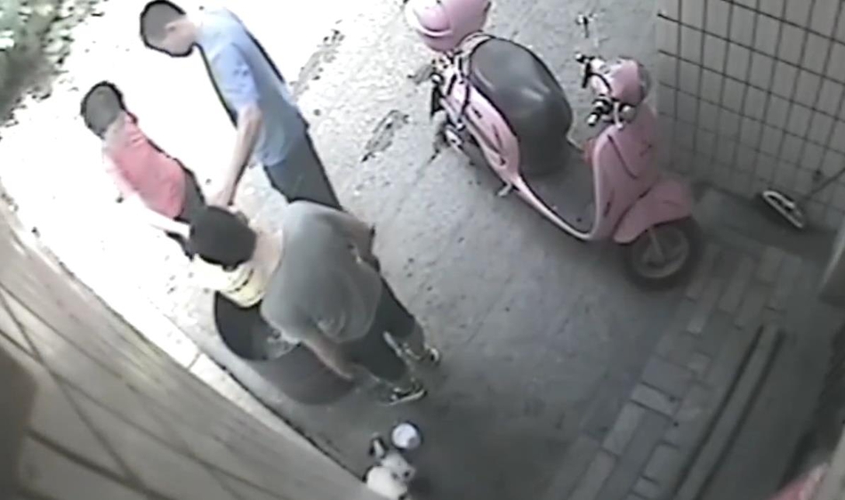 “然后我們以為那個小狗,那個桶那么高,它怎么能跳進(jìn)去。然后我們就調(diào)監(jiān)控,發(fā)現(xiàn)是鄰居家小孩做的?!眻D為男童抓起小狗將其扔進(jìn)火盆。