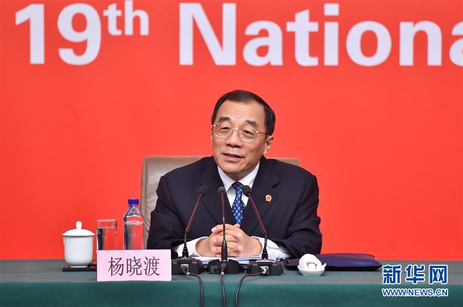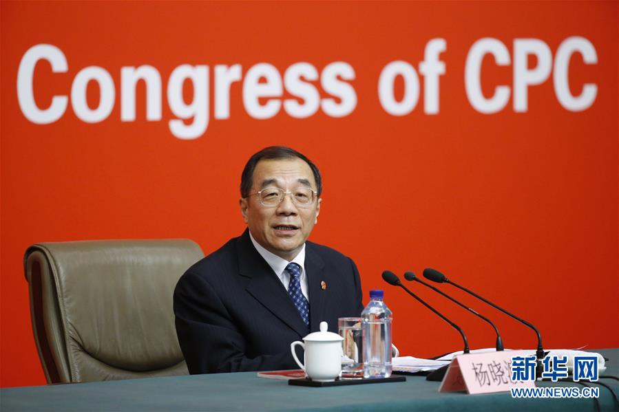 10月19日,中國共產(chǎn)黨第十九次全國代表大會新聞中心舉行記者招待會,請中共中央紀(jì)律檢查委員會副書記、監(jiān)察部部長、國家預(yù)防腐敗局局長楊曉渡,中共中央組織部副部長齊玉介紹加強黨建工作和全面從嚴(yán)治黨情況,并回答記者提問。這是楊曉渡在介紹情況。新華社記者 李鑫 攝