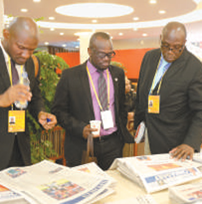 外國(guó)記者在十九大新聞中心翻閱報(bào)紙,了解十九大新聞。 人民視覺 |