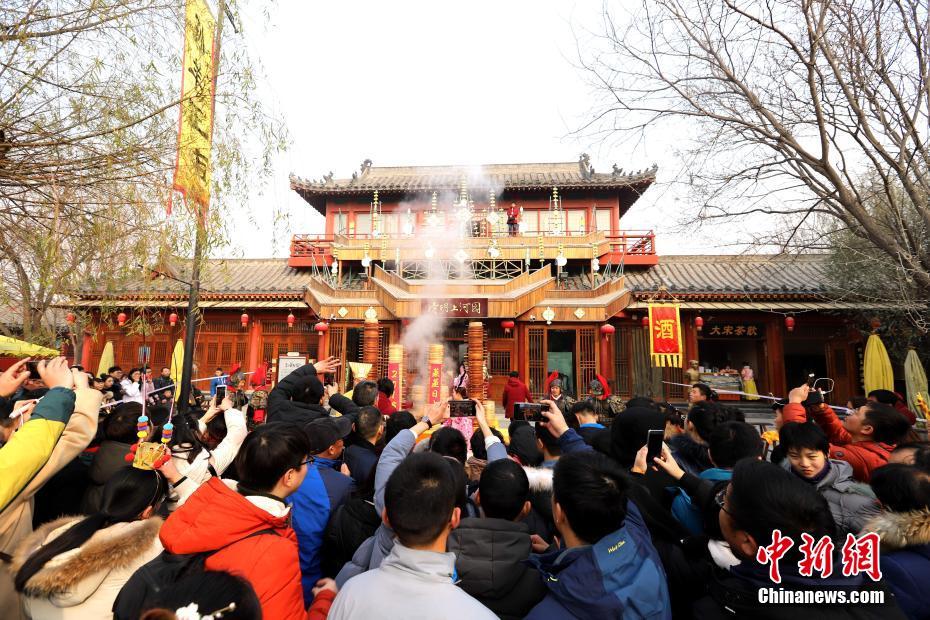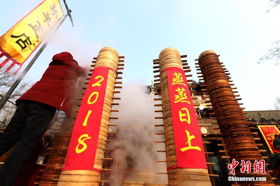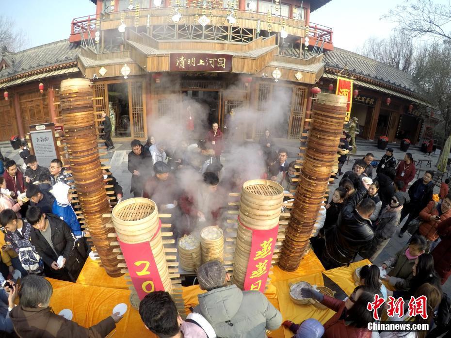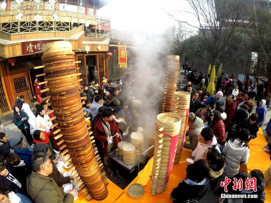 2018年1月1日,河南開(kāi)封清明上河園孫羊正店門(mén)前,現(xiàn)場(chǎng)高高疊起的小籠包熱氣騰騰,小籠包上喜慶的紅字寫(xiě)著“2018”“蒸蒸日上”。“宋徽宗”帶領(lǐng)“后宮佳麗”為游客免費(fèi)發(fā)放剛剛蒸好的小籠包,寓意新的一年“蒸蒸日上”,吸引數(shù)千名游客爭(zhēng)相品嘗求好運(yùn)。據(jù)清明上河園市場(chǎng)部石經(jīng)理介紹,為了給游客送上這份新年祝福,清明上河園啟用了多個(gè)地方一起蒸小籠包,當(dāng)天共準(zhǔn)備了2018籠開(kāi)封名吃“灌湯包”,在多個(gè)發(fā)放點(diǎn)陸續(xù)為民眾送上新年的“免費(fèi)午餐”,祝愿大家都能夠在新的一年里“蒸蒸日上”。中新社記者 王中舉 攝