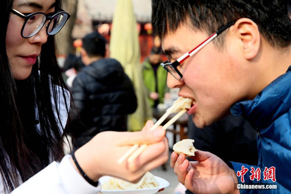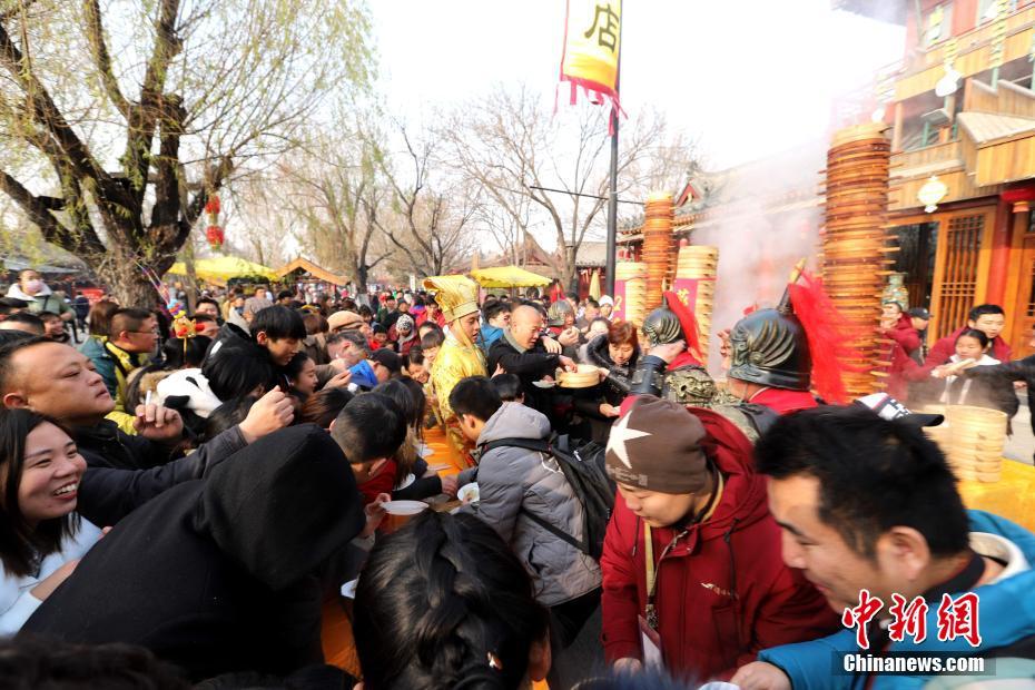 2018年1月1日,河南開(kāi)封清明上河園孫羊正店門(mén)前,現(xiàn)場(chǎng)高高疊起的小籠包熱氣騰騰,小籠包上喜慶的紅字寫(xiě)著“2018”“蒸蒸日上”?!八位兆凇睅ьI(lǐng)“后宮佳麗”為游客免費(fèi)發(fā)放剛剛蒸好的小籠包,寓意新的一年“蒸蒸日上”,吸引數(shù)千名游客爭(zhēng)相品嘗求好運(yùn)。據(jù)清明上河園市場(chǎng)部石經(jīng)理介紹,為了給游客送上這份新年祝福,清明上河園啟用了多個(gè)地方一起蒸小籠包,當(dāng)天共準(zhǔn)備了2018籠開(kāi)封名吃“灌湯包”,在多個(gè)發(fā)放點(diǎn)陸續(xù)為民眾送上新年的“免費(fèi)午餐”,祝愿大家都能夠在新的一年里“蒸蒸日上”。中新社記者 王中舉 攝
