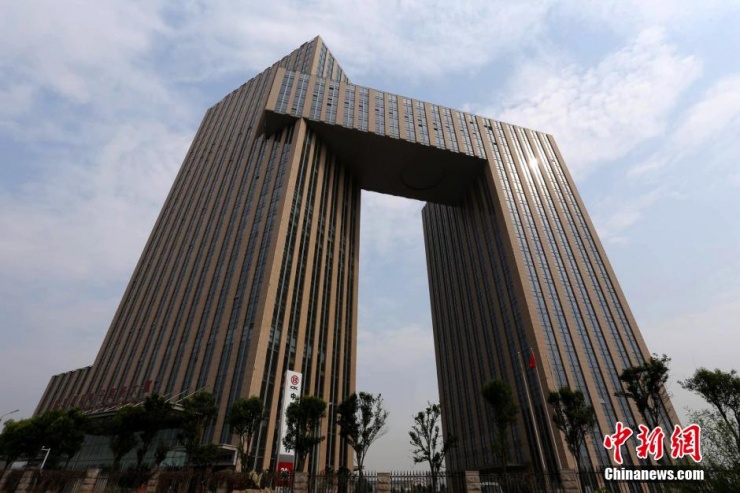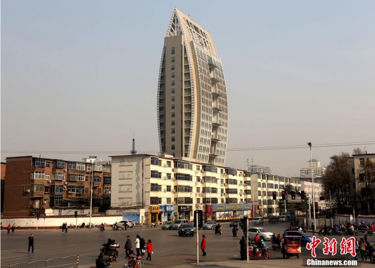 河南省鶴壁市淇濱區(qū)淇水大道與珠江路交匯處的龍門大廈外形酷似一個|“板凳”,看到的人紛紛稱奇。