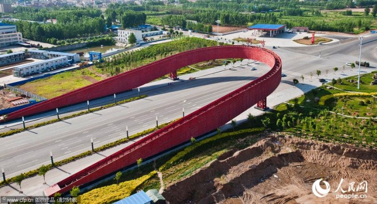 洛陽市伊川縣洛伊快速通道伊川界的伊川北大門建成,設(shè)計雷人,既像是一條紅腰帶,又酷似一個圈套,遭到網(wǎng)友虐稱:進出城要鉆“褲腰帶”。
