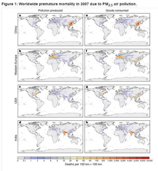 另外,環(huán)環(huán)(ID:huanqiu-com) 發(fā)現(xiàn)這篇研究中提到,中國在全球貿(mào)易中所受到的污染影響更為嚴重。其中,中國有超過10.86萬人過早死亡與西歐、美國的消費相關(guān)聯(lián)。
