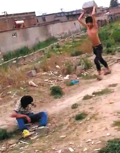 視頻顯示,6分45秒時,一名打人者搬起一塊石頭,向少年背部砸去。隨后,該男子再次搬起石塊,向后走幾米遠,舉起石塊朝少年頭上砸。少年當場昏厥,打人者則對著少年臉部撒尿。