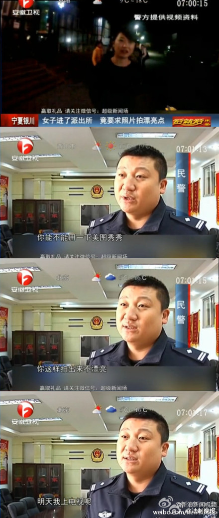 人民網北京11月4日電 據(jù)寧夏回族自治區(qū)公安廳官方微博消息,日前,寧夏銀川,一名女子因搶奪執(zhí)法記錄儀,阻撓執(zhí)法被警察帶走。民警在審訊室準備對其拍照時,女子竟然要求民警用美圖軟件,聲稱:“你這樣拍出來不漂亮,明天我上電視吶?!?/p>