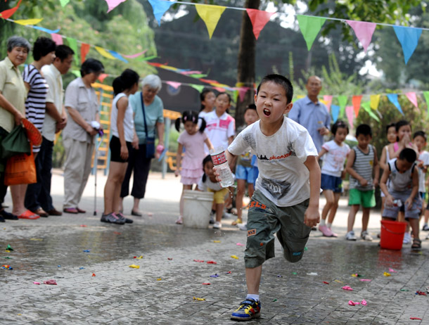 游戲規(guī)則:跑道前方設(shè)置一個水桶 起點外設(shè)置一個大塑料瓶,比賽開始時,小朋友持水杯到水桶內(nèi)盛水后返回倒入大塑料瓶處,由孩子和兩個家長依次進行盛水接力,大塑料瓶盛滿水者為勝(注:塑料瓶身內(nèi)設(shè)若干漏點)?;顒庸?個家庭參與,取前三名進行頒獎,所有參與的家庭均有參與獎。