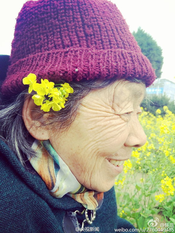 4月4日,網(wǎng)友“牦歌”在微博上曬出了一組照片,題為“你的皺紋比歲月更美”,照片的主角是“我奶奶”。一片金黃的油菜花田中,一位身穿灰色大衣,頭戴棗紅色線(xiàn)帽的老人或轉(zhuǎn)身回眸淺笑,或低頭輕聞花香,還45°角仰望天空,甚至單腳站立擺出“大”字狀。最可愛(ài)的要數(shù)老人擷取了一支油菜花插在耳邊,如果不是面龐已布滿(mǎn)皺紋,老人就如同一個(gè)嬌羞的小姑娘。圖為奶奶45°角仰望天空。