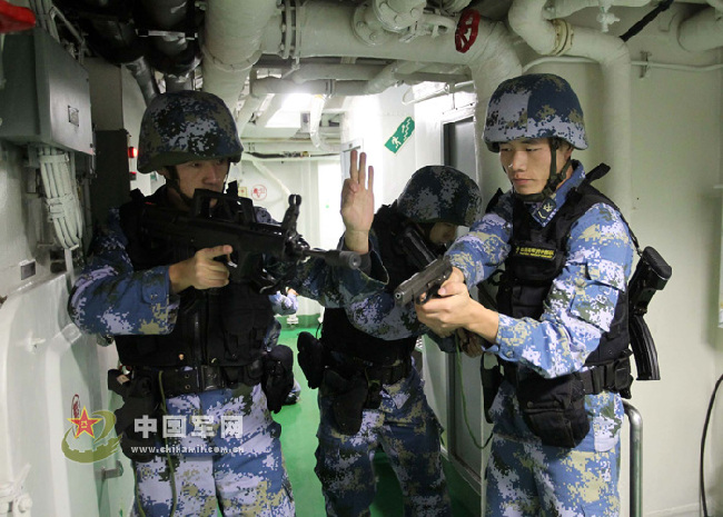 海軍第十一批護(hù)航編隊(duì)赴亞丁灣、索馬里海域執(zhí)行護(hù)航任務(wù)以來,針對(duì)海況復(fù)雜多變,海盜活動(dòng)更趨隱蔽、猖獗、頻繁等嚴(yán)峻特點(diǎn),編隊(duì)指揮所科學(xué)籌劃護(hù)航行動(dòng),研究掌握海盜活動(dòng)的特點(diǎn)規(guī)律,合理安排值更執(zhí)勤,加強(qiáng)巡邏警戒,狠抓各項(xiàng)制度落實(shí),搞好預(yù)想預(yù)測(cè),完善多套方案預(yù)案,著力提高快速反應(yīng)能力。在查證、驅(qū)離疑似海盜船只時(shí),確保預(yù)先發(fā)現(xiàn)、快速反應(yīng)、掌握主動(dòng),把兩個(gè)“百分之百”要求落到實(shí)處。圖為3月下旬編隊(duì)實(shí)施護(hù)航行動(dòng)時(shí)的一組場(chǎng)景。