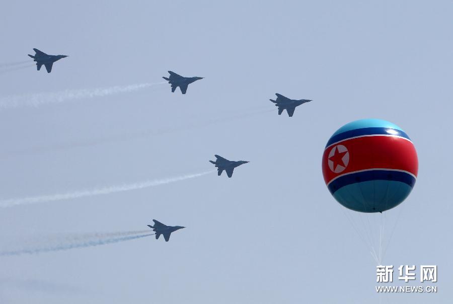4月15日,戰(zhàn)斗機在朝鮮首都平壤舉行的閱兵式上進行表演。當(dāng)日,朝鮮在金日成廣場舉行盛大閱兵式,慶祝金日成誕辰100周年。朝鮮國家最高領(lǐng)導(dǎo)人金正恩出席閱兵式并發(fā)表演講。 新華社記者張利攝