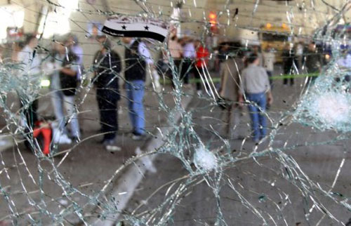 4月27日敘利亞首都大馬士革爆炸現(xiàn)場(chǎng),一輛中巴窗戶(hù)玻璃被震碎
