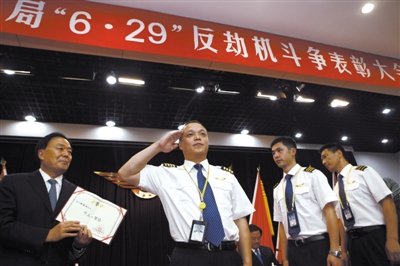 昨日下午,民航局在北京舉行“6·29”反劫機(jī)斗爭表彰大會,授予海航集團(tuán)旗下天津航空公司GS7554航班機(jī)組“中國民航反劫機(jī)英雄機(jī)組”榮譽(yù)稱號,獎勵人民幣100萬元。民航局同時還對參與“6·29”反劫機(jī)斗爭的23名乘客表示慰問和感謝,并給予獎勵。