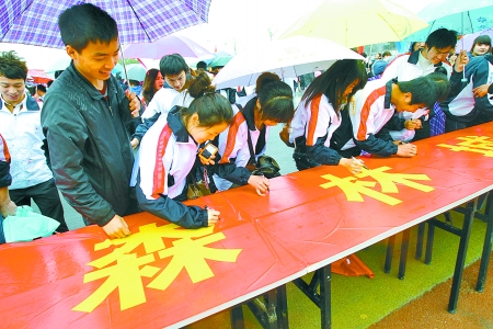 大學(xué)生在創(chuàng)建森林城市工作啟動儀式上簽名