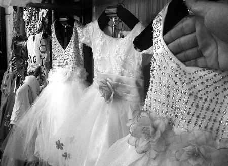 在緯四路服裝批發(fā)市場,帶有“亮片、珍珠、仿水鉆貼片”的童裝,往往被擺在各家入口顯眼處。女裝的裝飾品,多集中在領(lǐng)口、袖口、前胸、腰帶、裙擺,男裝則多用亮片突出胸前的商標(biāo)圖案或是數(shù)字圖形?!艾F(xiàn)在的孩子都喜歡穿花哨的衣服,嫌傳統(tǒng)的印花童裝單調(diào)、老土?!币慌l(fā)商直言,只要是經(jīng)濟(jì)條件允許,給孩子買衣服的家長往往是“孩子指啥買啥?!庇捎谶@些“配飾”易掉,為了滿足家長的需要,一些老板還自備了“亮片”,供家長給孩子補(bǔ)圖案時(shí)用。