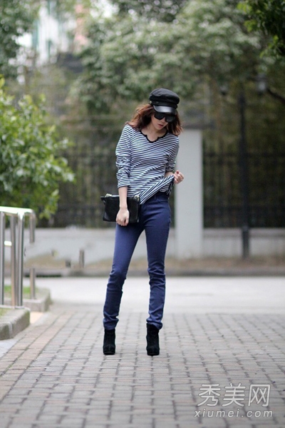 藍(lán)色條紋長袖T恤搭配藍(lán)色鉛筆褲,喜歡藍(lán)色的女生可以學(xué)學(xué)這身搭配,比較簡單但很有氣場。配上蓋帽和同色高跟鞋,挺有歐美風(fēng)格。
