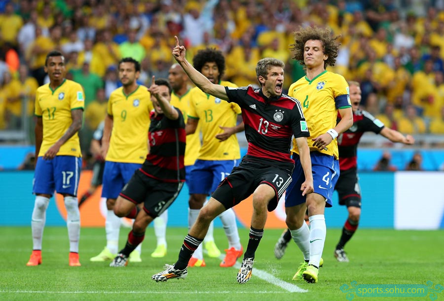 北京時(shí)間7月9日凌晨4時(shí),2014年巴西世界杯首場(chǎng)半決賽在貝洛奧里藏特的米內(nèi)郎體育場(chǎng)進(jìn)行,東道主巴西迎戰(zhàn)上屆季軍德國(guó)。最終,德國(guó)隊(duì)?wèi){借在18分鐘內(nèi)連入5球的攻擊狂潮以及下半場(chǎng)許爾勒替補(bǔ)登場(chǎng)后的梅開二度,7-1超大比分淘汰巴西,昂首晉級(jí)決賽。第10分鐘,穆勒利用角球機(jī)會(huì)首開紀(jì)錄。第22分鐘,克洛澤門前兩連擊攻入世界杯第16球,超越羅納爾多,成為世界杯進(jìn)球第一人。第24分鐘和第25分鐘,克羅斯1分鐘內(nèi)連入2球。第28分鐘,赫迪拉又接厄齊爾傳球打進(jìn)一球。第68分鐘,許爾勒又接拉姆助攻,門前包抄打門得手。第79分鐘,許爾勒禁區(qū)左側(cè)小角度攻入世界波。第90分鐘,奧斯卡才攻入挽回顏面的一球。
