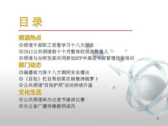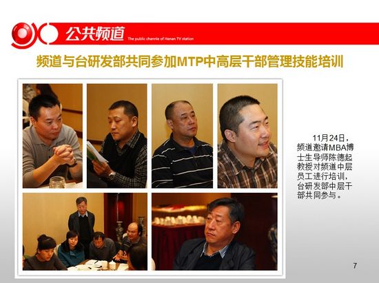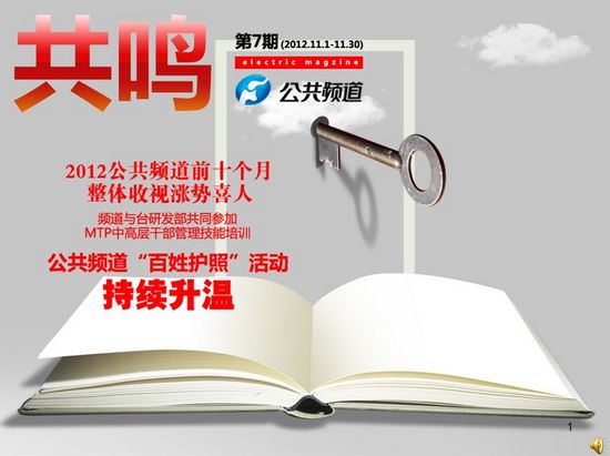 頻道干部職工觀看學(xué)習(xí)十八大報(bào)告,2012公共頻道前十個(gè)月整體收視漲勢(shì)喜人,頻道與臺(tái)研發(fā)部共同參加MTP中高層干部管理技能培訓(xùn)。