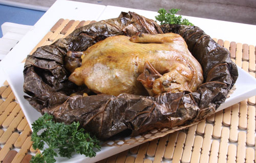 “叫化雞”原出于浙江杭州,是一些窮苦難民即“叫化子”或偷或討來的雞,經(jīng)過燒熱的土句熟而成,本是不登大雅之堂街頭菜。當(dāng)年那位清乾隆皇帝微服出訪江南,不小心弄得破衣爛衫流落街頭。其中一個叫化子頭看他可憐,便把自認(rèn)為美食的“叫化雞”送給他吃,乾隆困餓交加,當(dāng)然覺得這雞異常好吃,急問其名,叫化頭不好意思說這雞叫“叫化雞”,便胡吹這雞叫“富貴雞”。乾隆就說這“富貴雞”好吃。