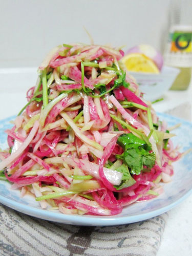 取一個(gè)綠皮水果蘿卜,去皮,切絲,加入少許調(diào)料,拌勻即可,做法簡(jiǎn)單,味道不錯(cuò)。在調(diào)料上,加入少許橙汁或檸檬汁,讓蘿卜入口后口感更豐富而有層次,有著淡淡的橙子香氣?!?/p>