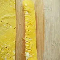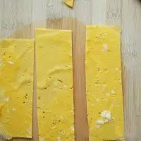 1. 雞蛋打散加少許鹽,淀粉加少許水調(diào)勻,加在蛋液中攪拌均勻,平底鍋小火,倒入蛋液,煎成薄薄的蛋皮,切成寬約4厘米的長(zhǎng)條。