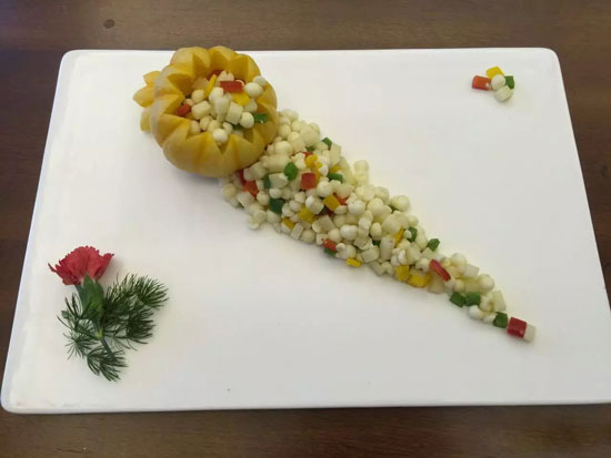 4.把山藥丁,芡實,青椒焯水,炒制,加入鹽,蘑菇粉,流水芡調(diào)味。裝入金瓜即可。