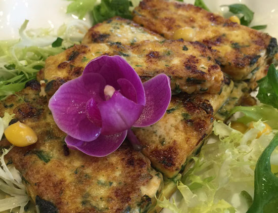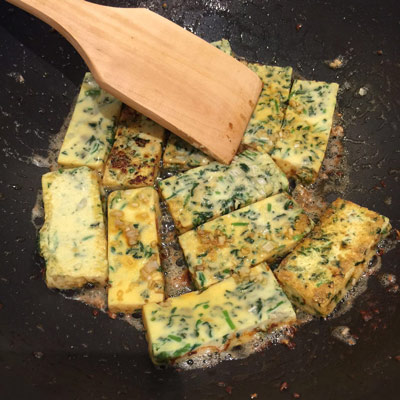 六、煎野菜豆腐。鍋中加入少許油,熱鍋涼油放入豆腐,小火煎制。只要豆腐開(kāi)始起皮,即可放入少許生抽調(diào)味,再放入蔥姜末炒香。