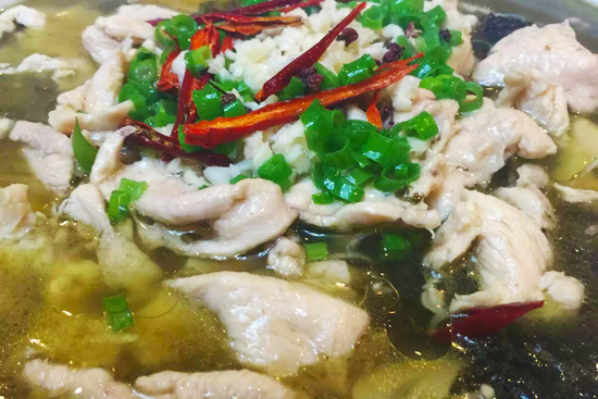 原料:雞脯肉、酸菜、土豆粉、泡椒、大蒜片、花椒。