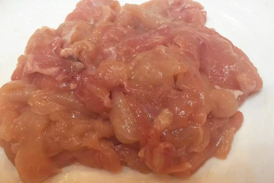 1.先把雞脯肉改刀切成薄片。然后一定要腌制上漿,放入鹽、味精、料酒,抓拌均勻后放入生粉,一定要抄一個方向使勁打,這樣雞脯肉就不會柴,會有滑嫩的口感。