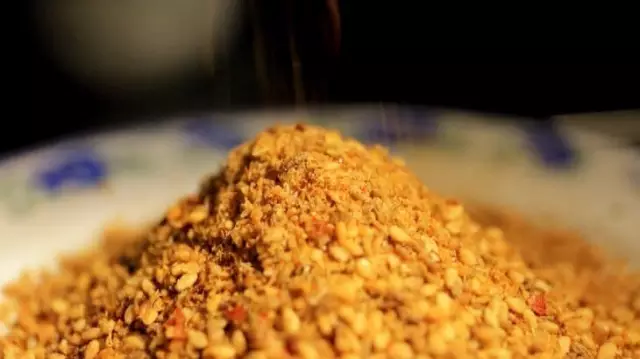 別著急,據(jù)說裹上干料味更好,滋滋冒油的肉蘸上黃色孜然料,一入口熱辣鮮香混著孜然味道,咬下的一瞬間就有肉汁兒噴出,羊肉肉質(zhì)很嫩吃起來沒有膻味。
