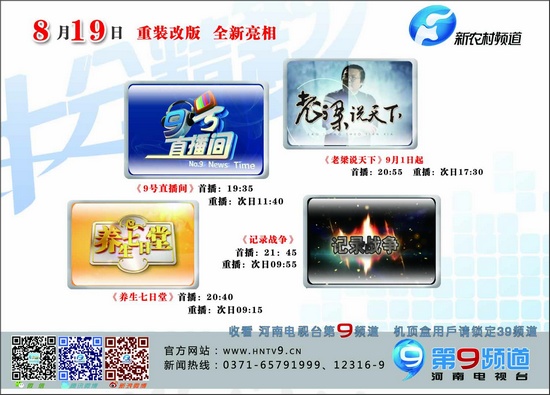 8月19日新農(nóng)村頻道全新亮相!19:35《9號(hào)直播間》;20:40《養(yǎng)生七日堂》;21:45《記錄戰(zhàn)爭》;四檔電影,視覺盛宴!14:43《第9放映室午間版》,17:55《群影匯》,22:00《第9放映室》,23:50《午夜影吧》,河南9套好電影,精彩不斷連連看!