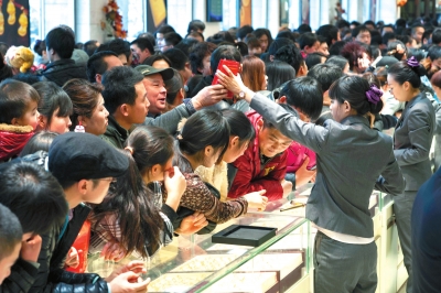 昨天,市民在菜百挑選黃金飾品。當天是新年第一天,北京各大金店出現(xiàn)消費者囤金迎新的火爆場景。其中,菜百各分店全天銷售額達到兩億元;中國黃金蔣宅口旗艦店投資金銷售超過150公斤。京華時報記者蒲東峰攝