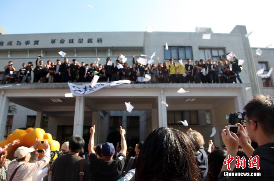 4月10日,以反“兩岸服貿(mào)協(xié)議”為名的臺(tái)灣學(xué)生離開了他們占據(jù)24天的“立法院”議場(chǎng)。 當(dāng)天下午3時(shí)半許,一部分原來從架設(shè)的鋁梯爬上“議場(chǎng)”后門水泥頂棚,再?gòu)亩谴皯襞来斑M(jìn)入“議場(chǎng)”的學(xué)生,身背隨身用品,選擇從原路離開,人數(shù)約有50人。圖為學(xué)生在“議場(chǎng)”后門頂棚集結(jié)準(zhǔn)備撤出。中新社發(fā) 陳立宇 攝