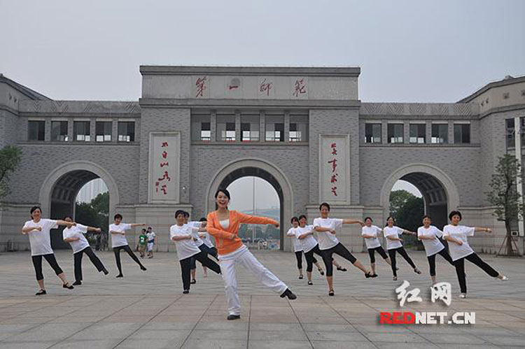 紅網(wǎng)長沙訊(記者廖潔)沒有吵鬧的音樂,動作優(yōu)雅舒展,6月13日傍晚,在湖南第一師范學(xué)院前坪,中老年教師們練習(xí)的一種特別的廣場舞十分引人注目。