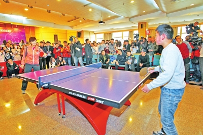 奧運(yùn)會(huì)內(nèi)地金牌運(yùn)動(dòng)員在香港進(jìn)行乒乓球示范表演,與市民互動(dòng)。